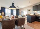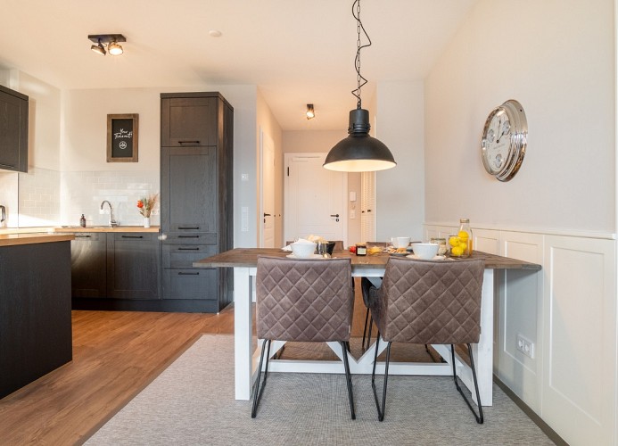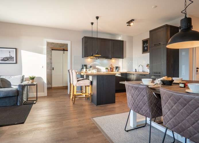 Der lichtdurchflutete Wohnbereich ist mit einer gemütlichen Sofaecke und einem Flatscreen-TV ausgestattet. Genießen Sie schon morgens beim Frühstück den herrlichen Ausblick zur See. Der offene Küchenbereich ist mit allen wichtigen Küchengeräten, Essgeschirr, sowie Besteck ausgestattet. Außerdem stehen Ihnen noch ein Backofen, ein Geschirrspüler und eine Nespressomaschine zur Verfügung.
