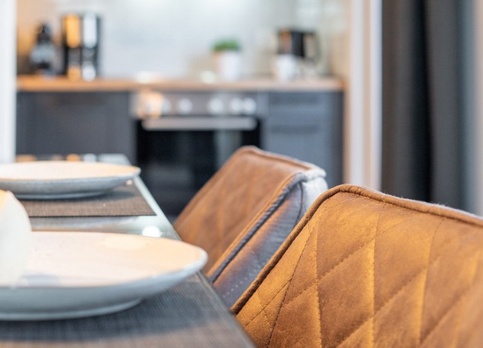 Der offene Küchenbereich ist mit allen wichtigen Küchengeräten, Essgeschirr, sowie Besteck ausgestattet. Außerdem stehen Ihnen noch ein Backofen, ein Geschirrspüler und eine Nespressomaschine zur Verfügung.