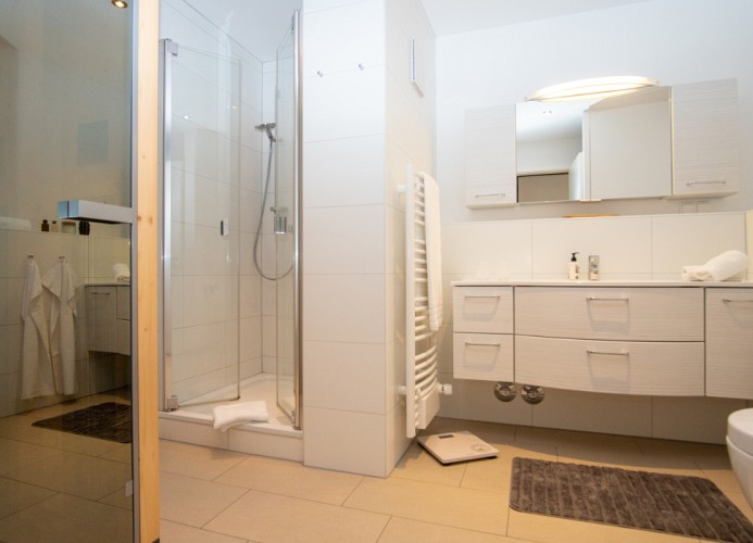 Urlauben Sie auf großzügigen 70 m² (2. Etage) mit Nordwest-Balkon. Das lichtdurchflutete Wohnzimmer ist mit einer gemütlichen Sofaecke, Flatscreen-TV und Kaminofen ausgestattet. Im Essbereich finden bequem vier Personen Platz zum Schlemmen. Die angrenzende Küchenzeile ist, für den Urlaubsbedarf, voll ausgestattet. Ein Backofen und ein Geschirrspüler gehören ebenso dazu, wie die Kaffeemaschine, der Wasserkocher und ein Toaster. Geschirr und Besteck sind ausreichend vorhanden. Vom Wohnzimmer aus gelangen Sie auf den Balkon mit Blick zur Ostsee. Das große Schlafzimmer verfügt über ein gemütliches Doppelbett (160*200cm). Das zweite Schlafzimmer ist mit zwei gemütlichen Einzelbetten, TV und einem geräumigen Schrank eingerichtet. Das Badezimmer ist mit einer ebenerdigen Dusche mit Glastrennwand und eine Infrarotsaune (für eine Person) ausgestattet.