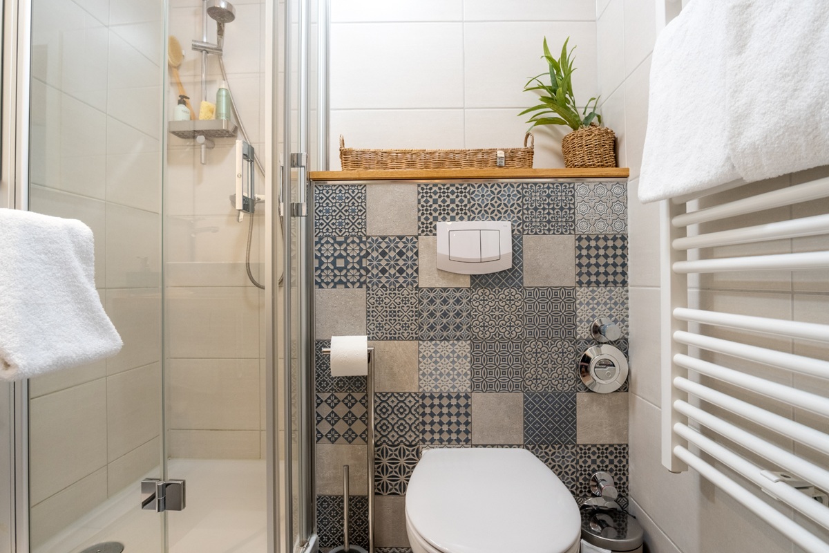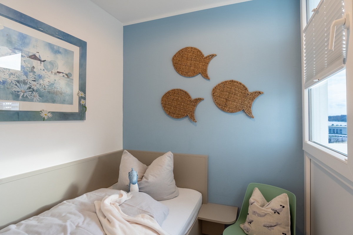 Das separate Kinderzimmer ist mit einem Einzelbett ausgestattet, das auch für Erwachsene geeignet ist. Das moderne Bad verfügt über eine Dusche mit Glastrennwand und niedrigem Einstieg.