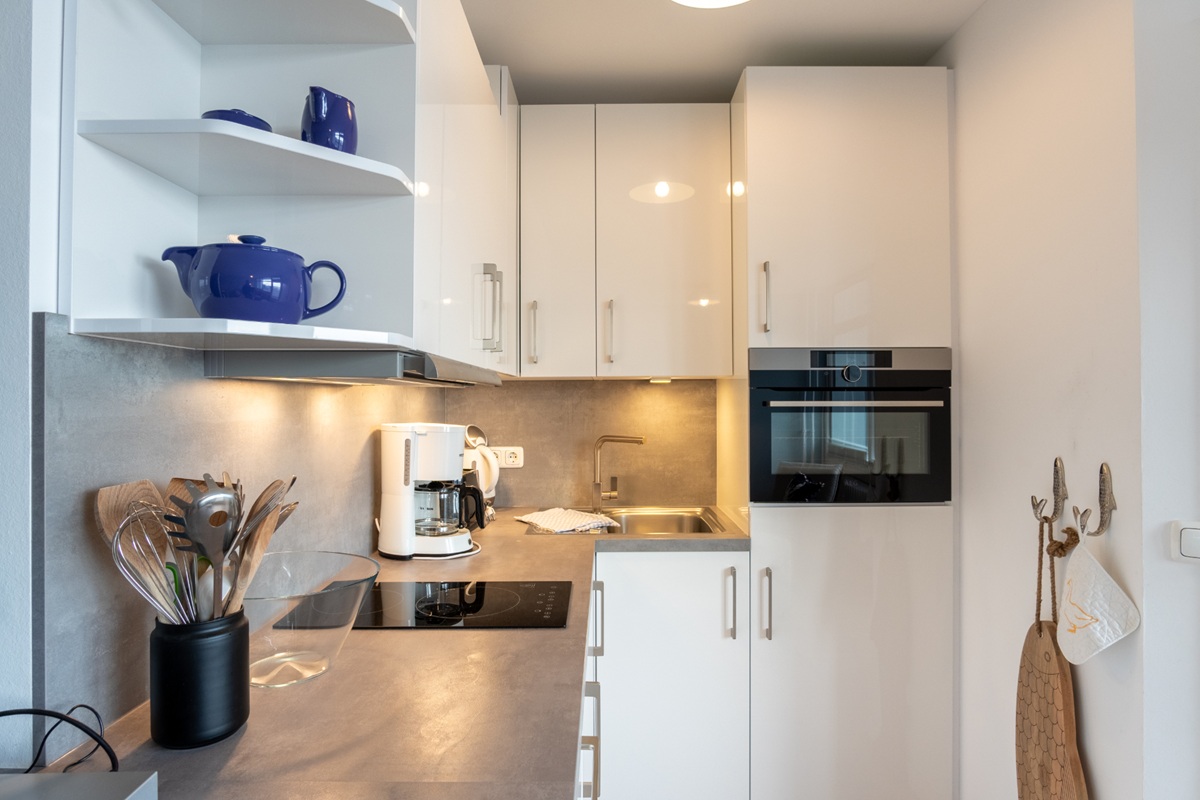 Der offene Wohn-Schlafbereich verfügt über ein gemütliches Doppelbett, eine bequeme Sofaecke mit Flatscreen-TV, einen Schaukelsessel und eine komfortable Essecke. Die voll ausgestattete Küche bietet alles, was Sie im Urlaub brauchen – inklusive Geschirrspüler und Backofen.