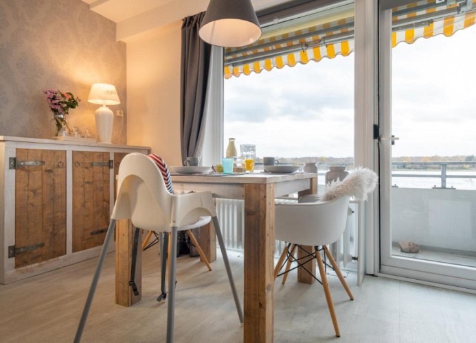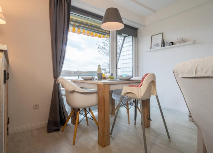 Der lichtdurchflutete Wohnbereich verfügt über ein gemütliches Sofa, einen Flatscreen-TV und vieles mehr. Vom Essbereich aus kann man schon beim Frühstück den herrlichen Ausblick zum Binnensee genießen! Vom Wohnbereich aus gelangen Sie auf den Südbalkon mit Seeblick.