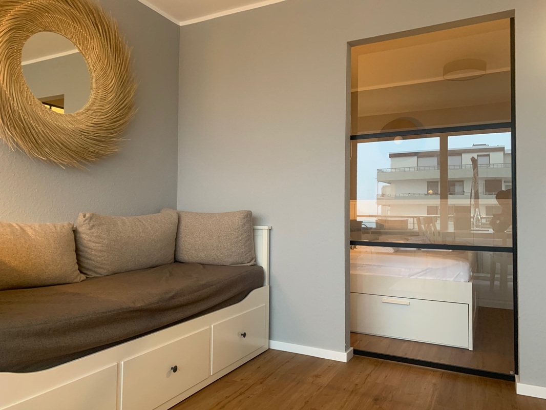 Der offene Küchenbereich ist, für den Urlaubsbedarf, voll ausgestattet. Eine Kaffeemaschine gehört ebenso dazu, wie der Wasserkocher und ein Toaster. Geschirr und Besteck sind ausreichend vorhanden. Außerdem steht Ihnen noch ein Backofen und ein Geschirrspüler zur Verfügung. Das Badezimmer wurde ebenfalls modernisiert: die Badewanne verfügt über eine Glastrennwand.