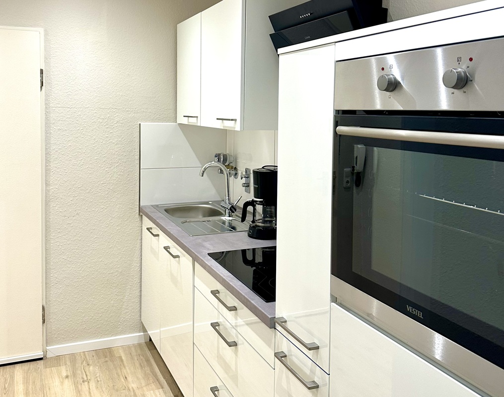 Der offene Küchenbereich ist, für den Urlaubsbedarf, voll ausgestattet. Eine Kaffeemaschine gehört ebenso dazu, wie der Wasserkocher und ein Toaster. Geschirr und Besteck sind ausreichend vorhanden. Das Badezimmer wurde ebenfalls modernisiert: die Badewanne verfügt über eine Glastrennwand.