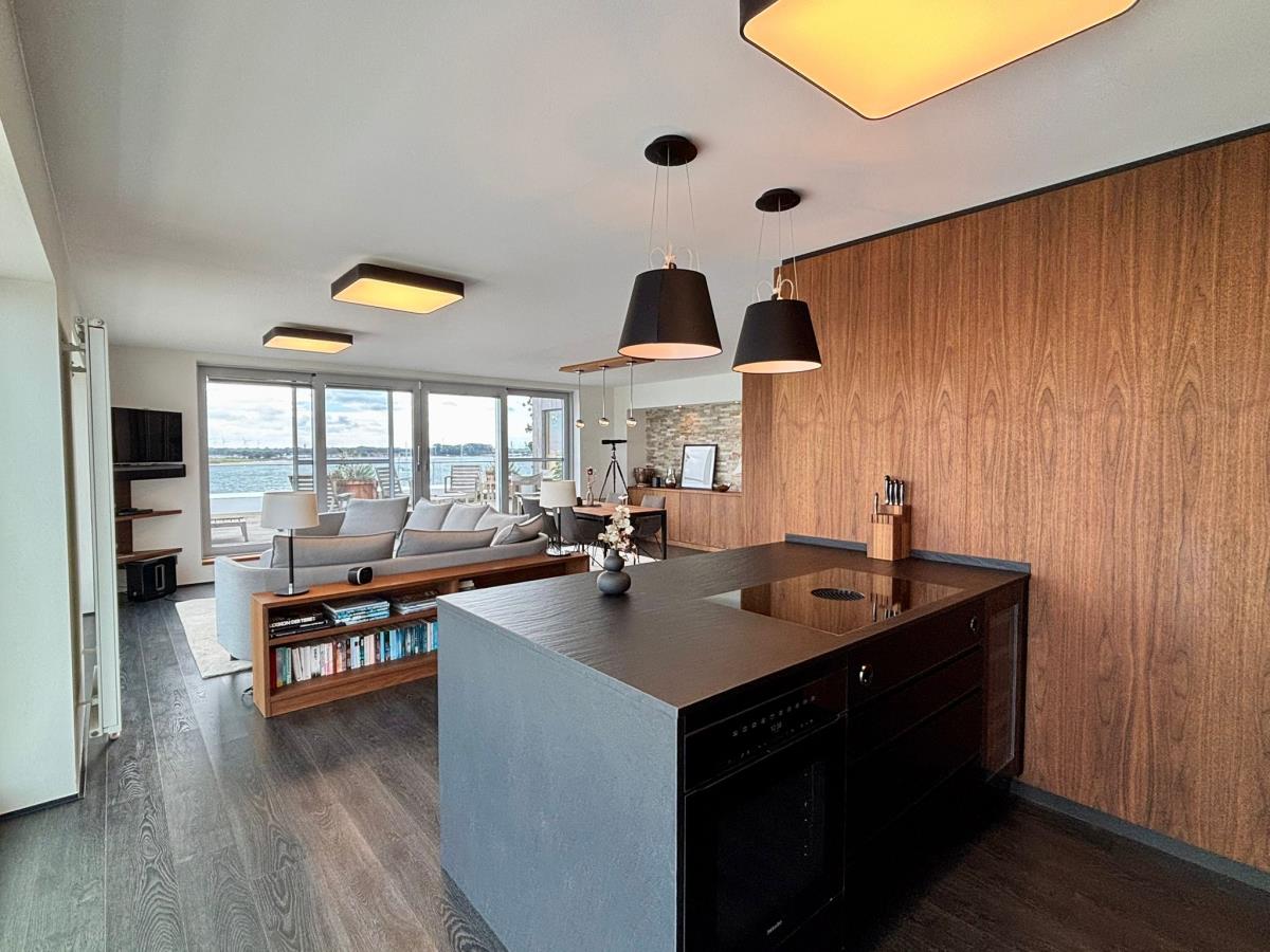 Der Wohnraum ist unterteilt in eine Loungesofaecke mit großem Smart-TV, Playstation, Sonos-Lautsprechersystem und dem Küchenbereich mit angrenzendem Essplatz. Hier lässt es sich prima schlemmen - mit Meerblick! Vom Wohnzimmer aus gelangen Sie auf die große Dachterrasse mit traumhaften Blick zur Ostsee und zu Großenbrodes Marina. Hier können Sie den Lütten beim Buddeln am Strand zuschauen oder einfach den herrlichen Ausblick bei einem leckeren Glas Wein genießen. Sonnenliegen gehören ebenso zu Ausstattung, wie der große Sonnenschirm.