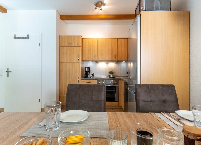 Die charmante 80m²-Ferienwohnung im Erdgeschoss des rustikalen Fachwerkhauses "Hinter den Höfen" heißt bis zu 4 Personen herzlich willkommen. Der sonnige Wohnbereich besticht durch eine gemütliche Sofaecke, einen Flatscreen-TV und eine Auswahl an Gesellschaftsspielen – ideal für gesellige Stunden. Für kuschelige Momente an stürmischen Schietwettertagen sorgt der Holzofen, der eine behagliche Atmosphäre zaubert. Direkt angrenzend befindet sich der offene Küchenbereich, der mit allem ausgestattet ist, was man für einen entspannten Urlaub braucht. Neben Herd und Kühlschrank stehen Ihnen auch ein Backofen, eine Mikrowelle und ein Geschirrspüler zur Verfügung – hier kann man sich so richtig verwöhnen lassen.