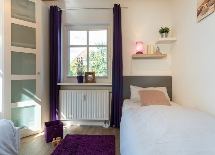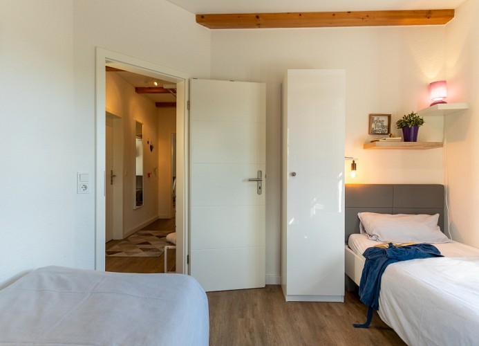 Das große Schlafzimmer ist mit einem komfortablen Doppelbett (ca. 180 x 200cm) ausgestattet und lädt zu erholsamen Nächten ein. Das Kinderzimmer bietet zwei Einzelbetten und ein Kinderreisebett, ideal für die kleinen Gäste. Ein kostenfreier Kinderhochstuhl rundet das Angebot für Familien ab.