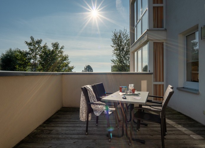 Die Wohnung verfügt über einen lichtdurchfluteten Wohnbereich mit einer gemütlichen Sitzecke mit Kaminofen, einer Essecke mit Blick ins Grüne und der angrenzenden offenen Küchenzeile. Vom Wohnbereich aus gelangt man auf den Balkon - man kann die Ostsee schon riechen. Im beiden Schlafzimmern erwartet Sie je ein gemütliches Doppelbett. Für Wellnessfans ist das Badezimmer bestens geeigent: eine eigene Sauna gehört neben einer Dusche ebenfalls zur Ausstattung.