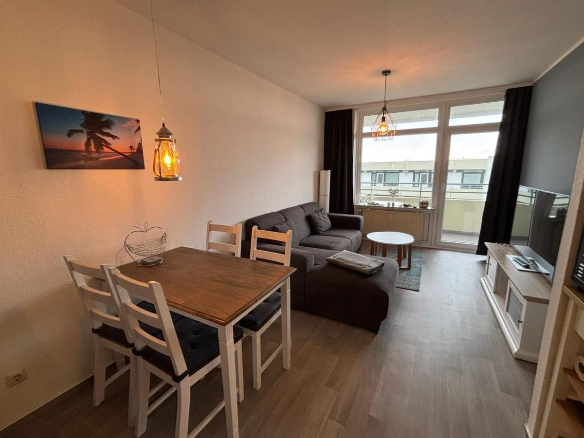 Der lichtdurchflutete Wohnbereich lädt mit einer komfortablen Sofaecke, TV und vielen kleinen Details zum Entspannen und Wohlfühlen ein. Vom Wohnraum aus gelangen Sie direkt auf den Balkon – genießen Sie hier eine Tasse Kaffee am Morgen oder ein Glas Wein am Abend, während Sie den seitlichen Meerblick und die frische Ostseeluft genießen.